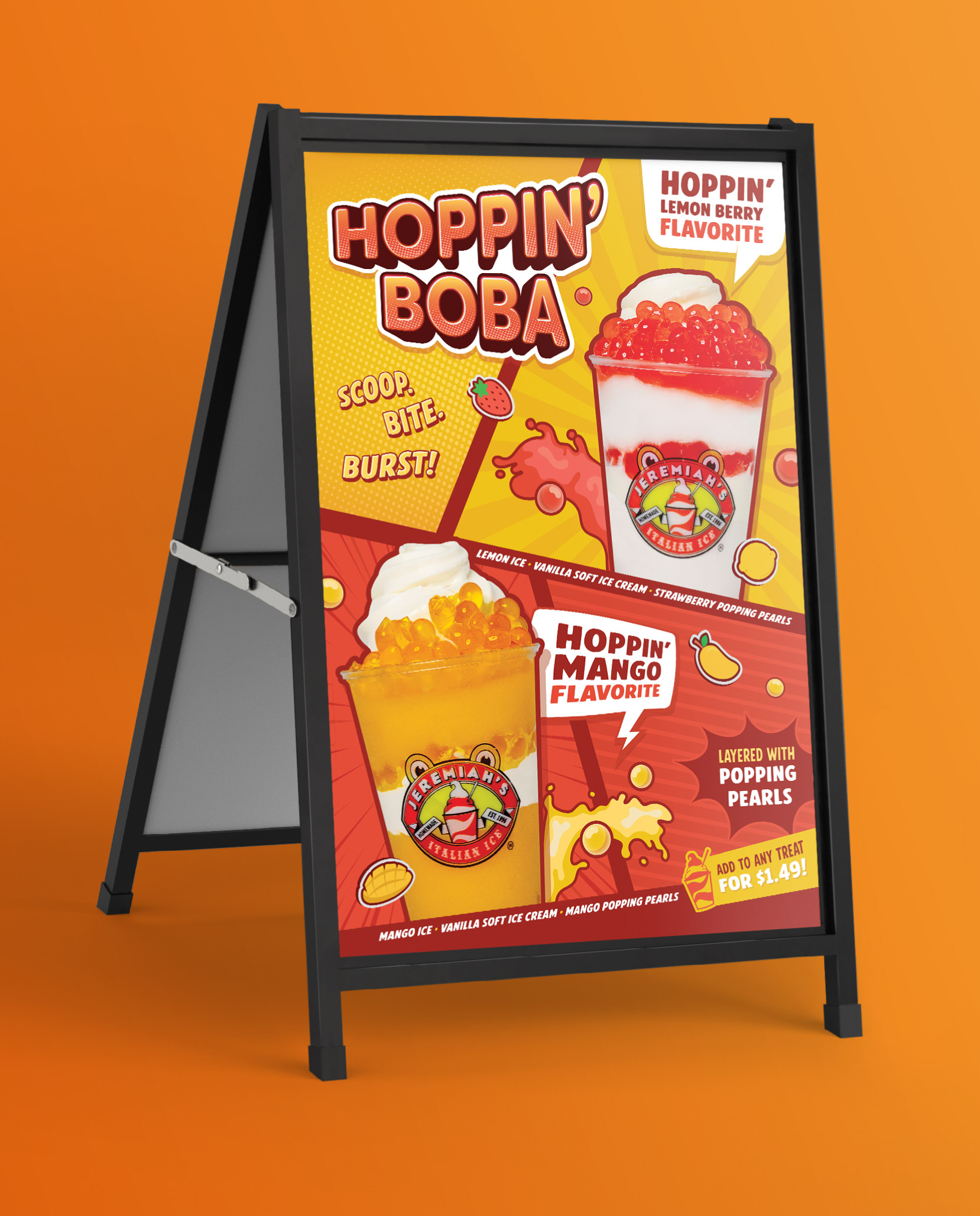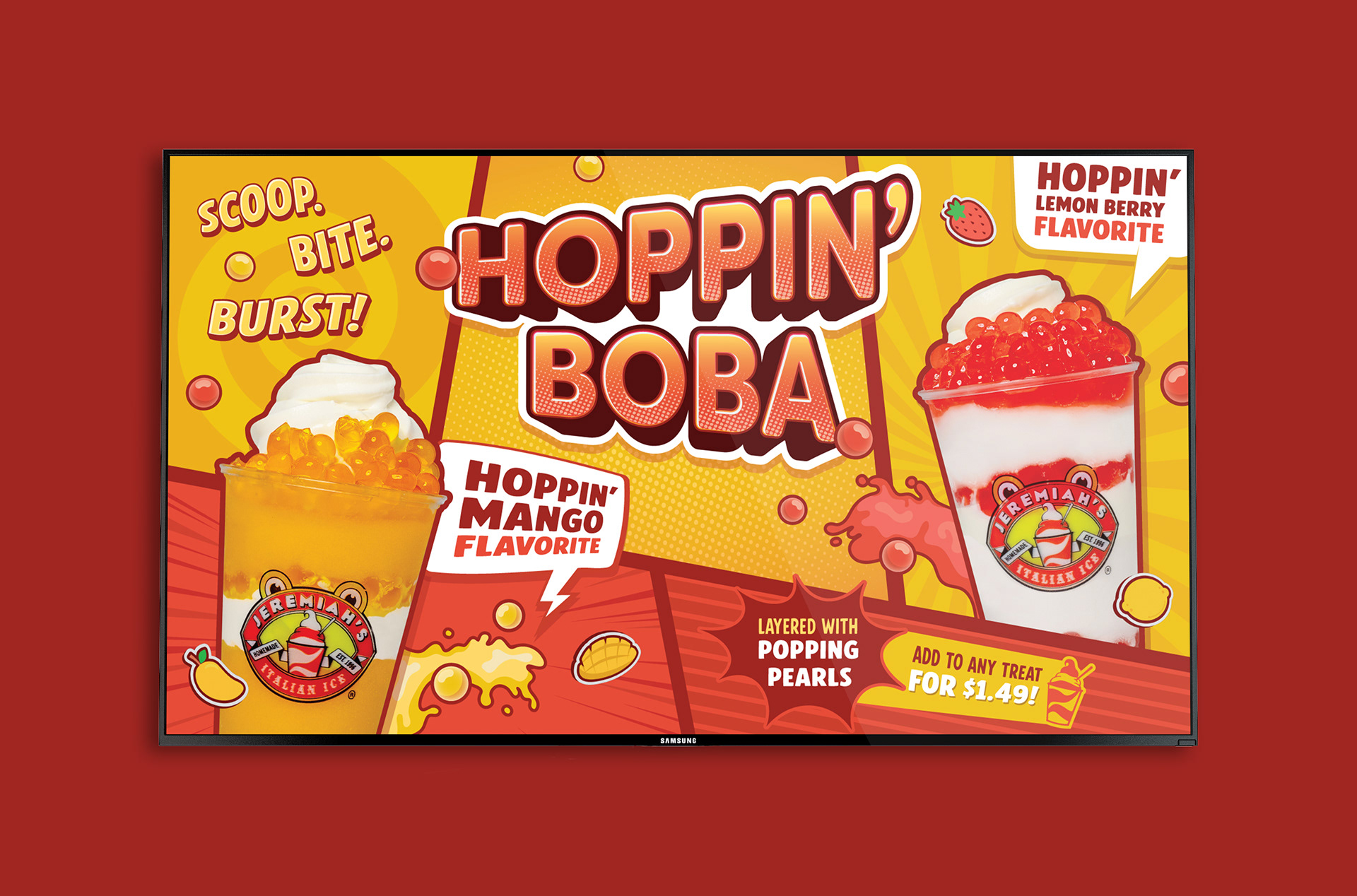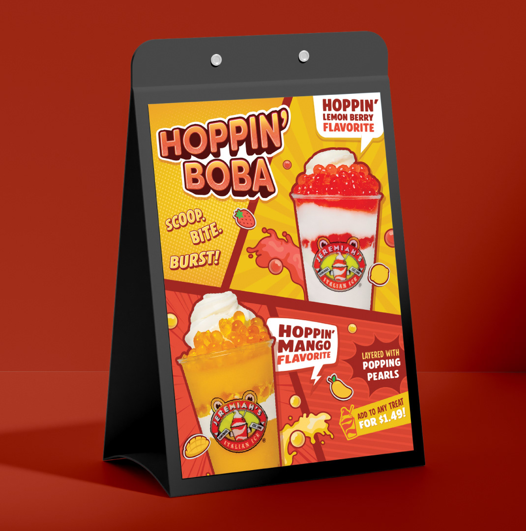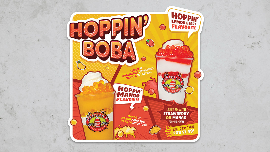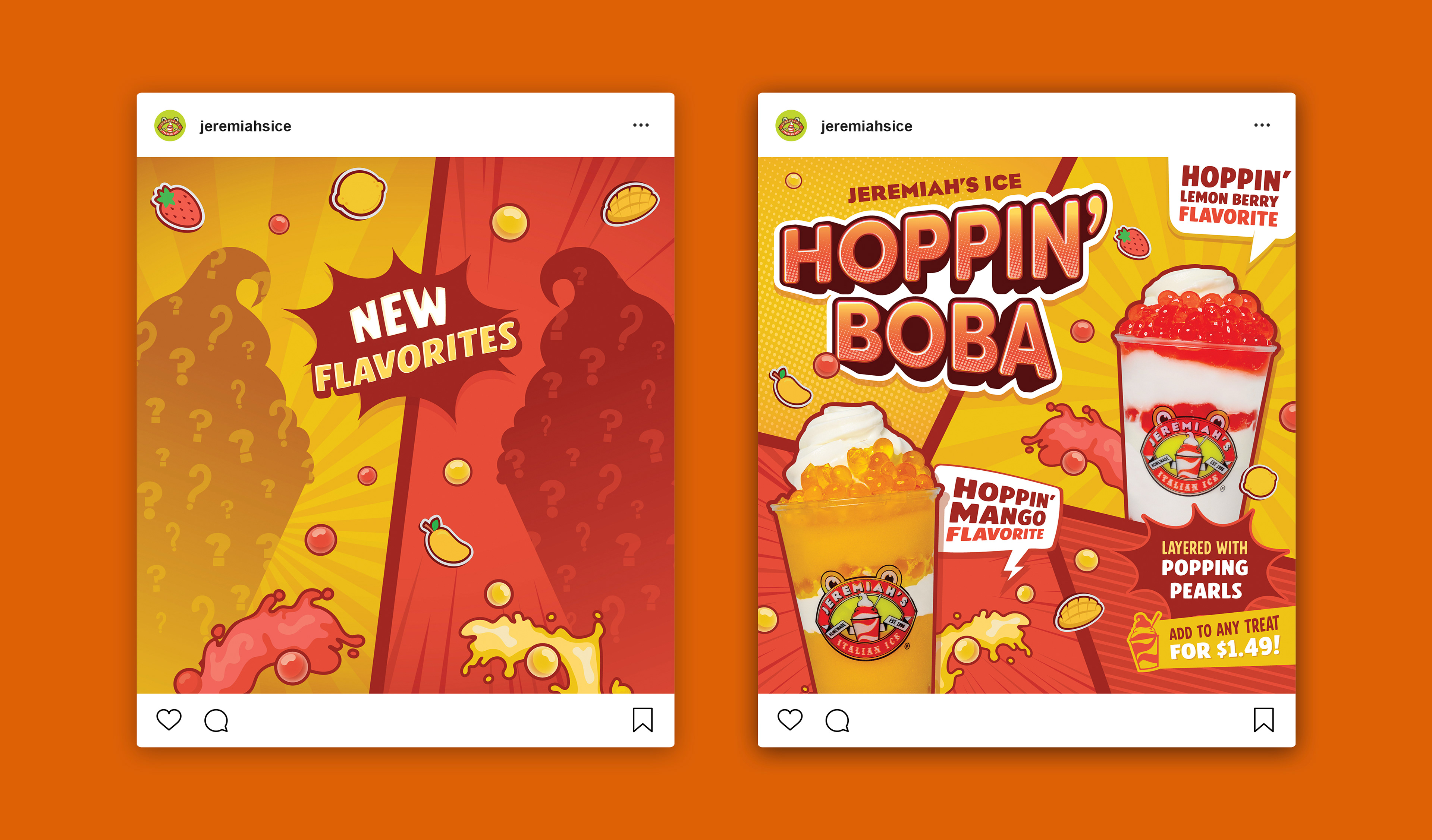 For Jeremiah’s limited-time Boba Layer-Ins launch, I designed assets for the Hoppin’ Boba campaign. I incorporated comic and anime inspired visuals to create an energetic promotion for the new topping and products.